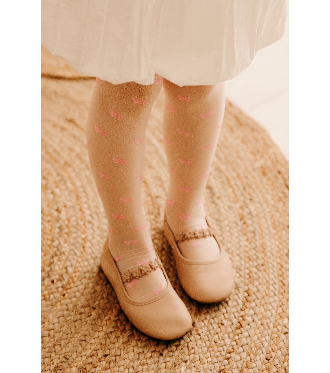 Детски тънък чорапогащник с плътност 15 DEN и дискретен фигурален десен с малки панделки по цялата дължина на крака. Еластична и мека плетка за удобно прилягане.