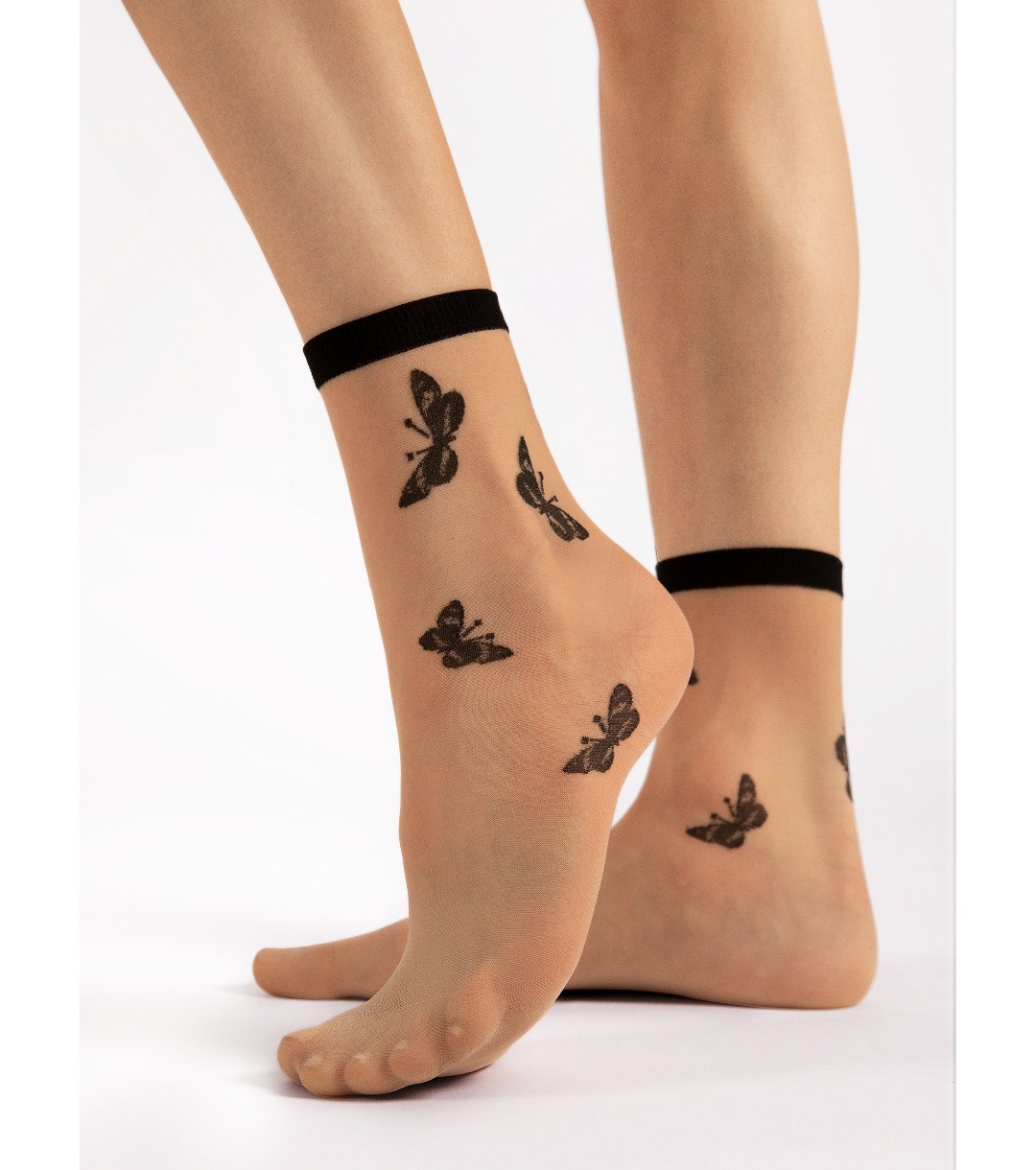 Тънки и прозрачни чорапи с фигурален мотив на пеперуди, разположени около глезена. Гладък, еластичен ластик в горната част. Невидимо подсилена, гладка предна част при пръстите. Материята е с копринено, матово покритие.